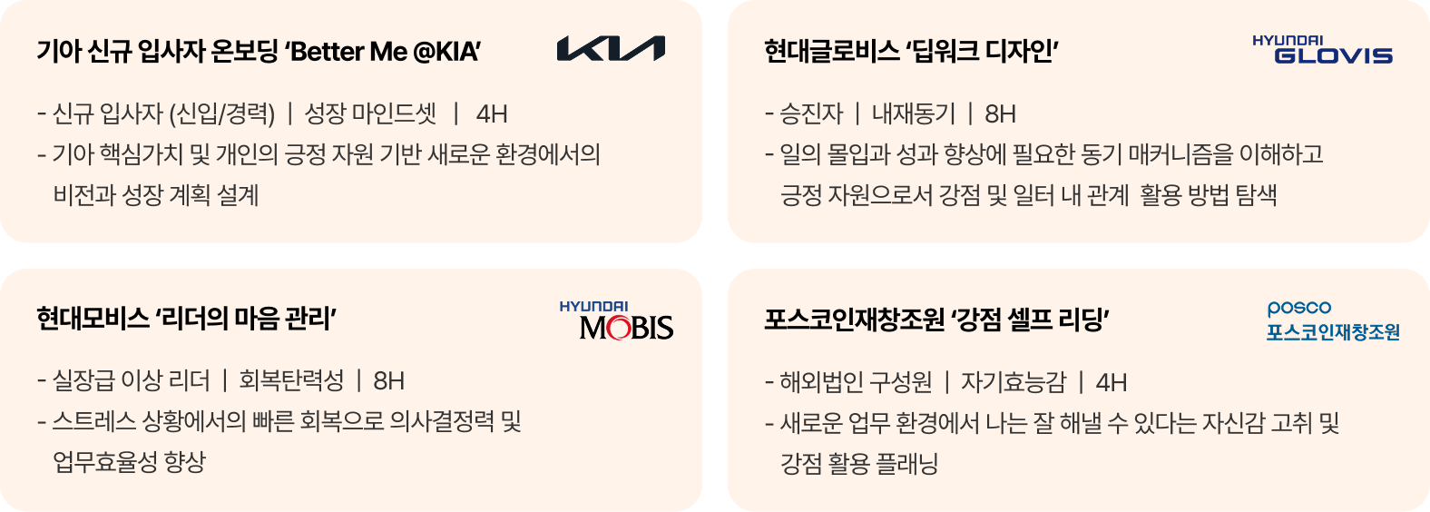 진행 내용 M1. 구성원 마음역량 강화를 위한 긍정심리 이론 M2. AI 마인드 진단 및 교구를 활용한 마인드 업스킬 워크숍 실습 M3. 퍼실리테이션 및 교구 활용 가이드
